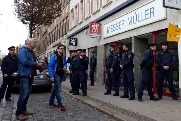 Einige Gegendemonstranten tauchten zudem in unmittelbarer Nähe zur offiziellen Einrichtung der Waffenverbotszone auf. Eine kleine Gruppe protestierte auf künstlerische Weise mit Pappschildern, die Handgranaten darstellen sollten. Später kamen Menschen mit Bannern und Sprechchören dazu. Diese begleiteten Wöller, Merbitz und Jung auch bei einem kleinen Abstecher zu einem Messergeschäft in der Eisenbahnstraße. Zwischenfälle waren nicht zu beobachten.