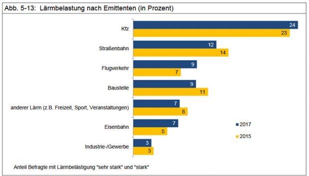 Die Lärmbelastung durch Straßenbahnen ist seit 2015 von 14 auf 12 Prozent gefallen, die durch Baustellen von 11 auf 9 Prozent.