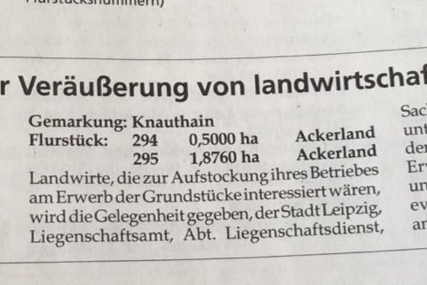Sowohl L-IZ als auch Grünen sei die Lektüre des Grundstücksverkehrsgesetzes ans Herz gelegt. Und die vollständige Lektüre der ‘Anzeige’, die hier nur teilweise wiedergegeben ist. Dann sollte klar werden, dass hier die sogenannte untere Landwirtschaftsbehörde pflichtgemäß über einen Verkauf von Flächen an Nichtlandwirte informiert und dies mit Flächen der Stadt vermutlich nichts zu tun hat, weil dafür das SMUL zuständig sein dürfte. Mir persönlich fehlt hier die Recherche vor der Aufregung.