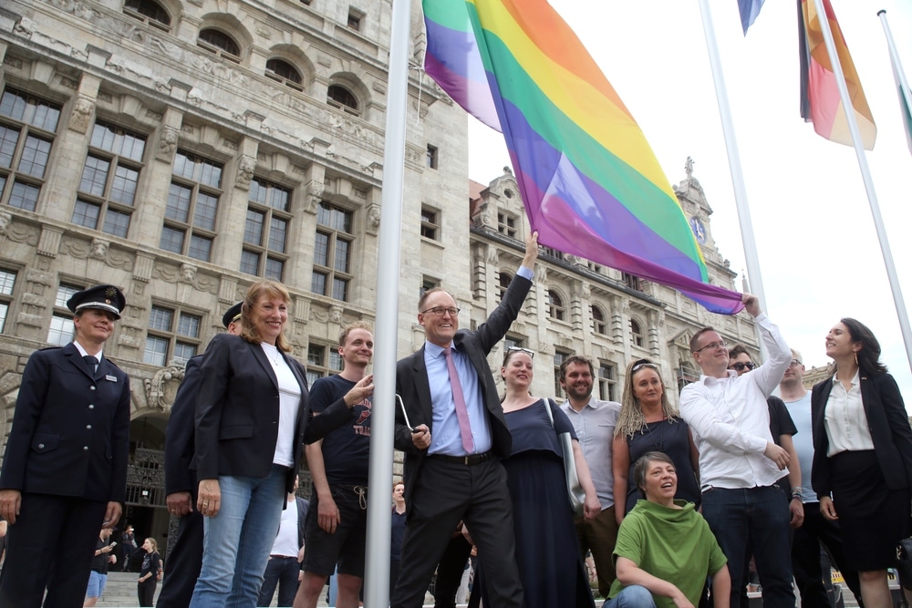 Seit dem 5. Juli 2019, 16 Uhr weht wieder die Regenbogenfahne vor dem Neuen Rathaus. Das Hissen des Symbols der LGBTIQ-Bewegung durch Verwaltungsdezernent Ulrich Hörning (SPD) bildete am Freitag den Auftakt der Leipziger CSD-Woche.
