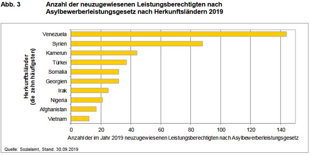 Was dann zumindest das Überraschende an den 2019er Zahlen sein dürfte: Denn erstmals stellten unter den „neuzugewiesenen Leistungsberechtigten“ Flüchtlinge aus Venezuela die Mehrheit, deutlich vor Menschen aus Syrien und Kamerun.