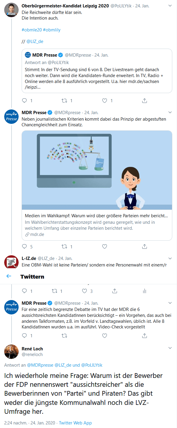 Auf Twitter musste die Frage offenbleiben, warum sich der Sender MDR bei einer Personenwahl wie die zum neuen OBM Leipzigs hinter den Regeln verschanzte, die für Parteienwahlen wie Landtags- oder Kommunalwahlen gelten. So teilte der Sender auf dem sozialen Netzwerk mit, dass „neben journalistischen Kriterien (…) dabei das Prinzip der abgestuften Chancengleichheit zum Einsatz“ käme.