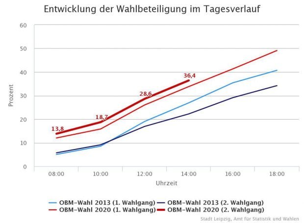 Die Wahlbeteiligung in Leipzig um 14 Uhr zur OBM-Wahl 2020. Chart von Leipzig.de
