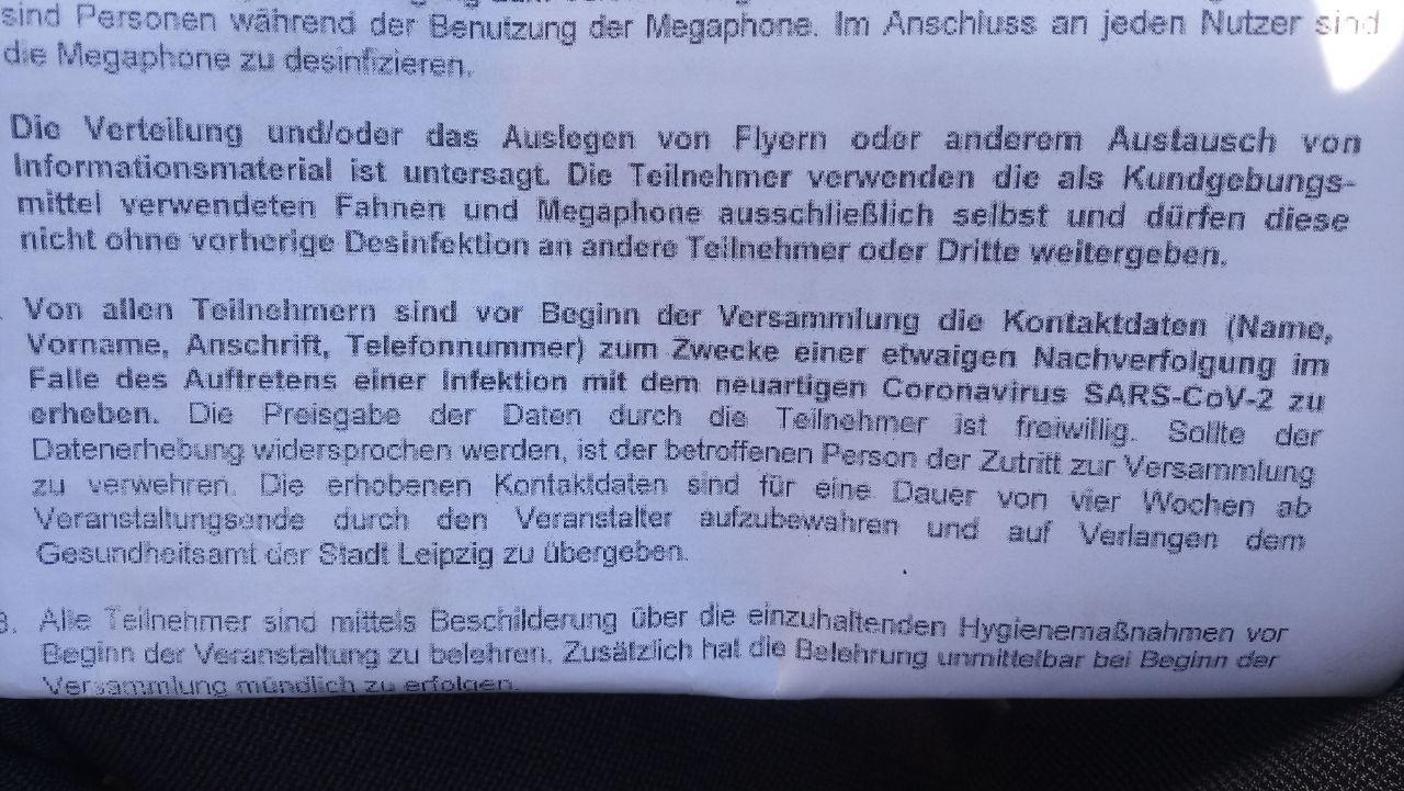 Corona-Regeln am heutigen 20. April 2020 auf der PARTEI-Demo laut Ordnungsamt Leipzig. Foto: L-IZ.de