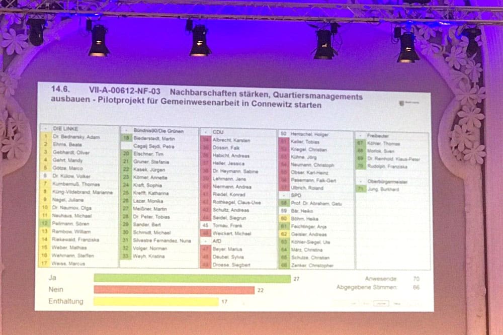 Auch ein von der Linksfraktion eingereichter Änderungsantrag sei wichtig. Diese forderte die Stadtverwaltung dazu auf, einen „Kriterienkatalog für die Einrichtung weiterer Quartiersmanagements“ zu entwickeln. Dabei sollten Indikatoren wie Armutsquote, der Anteil von Migrant/-innen und der Wohnungsmarkt berücksichtigt werden. Doch diesen Antrag zogen die Linken kurzfristig zurück.