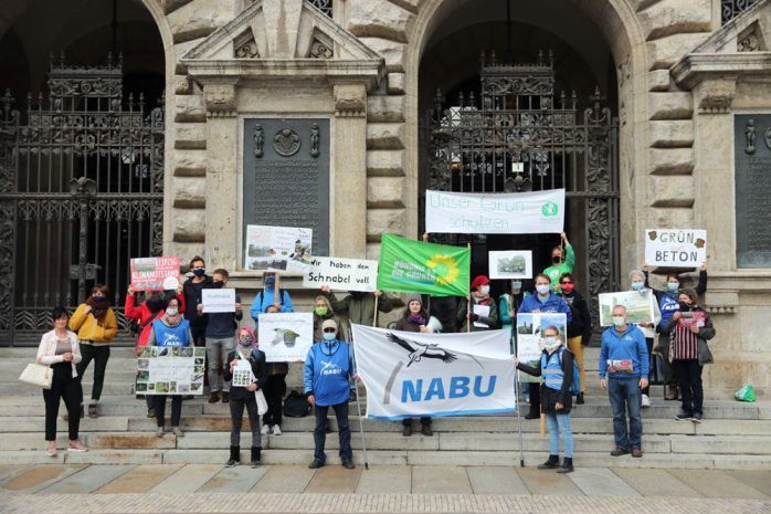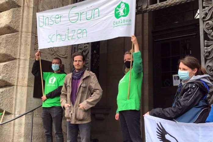 Obwohl der Tagesordnungspunkt zum Wilhelm Leuschner Platz wegen weiterem Beratungsbedarf abgesagt wurde, kamen Basisgrüne und NABU Leipzig zur Demo wegen Naturschutzfragen bei dem Bebauungsvorhaben.
