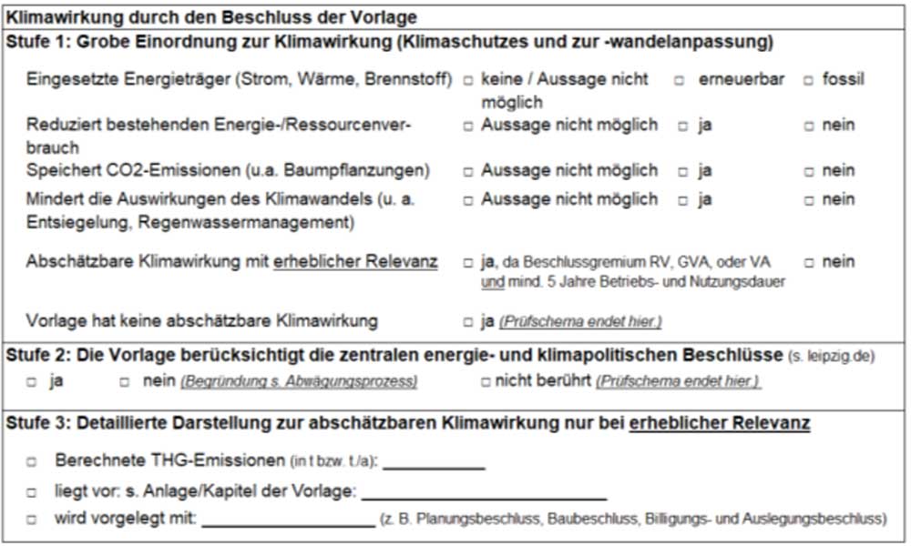 Das von der Verwaltung vorgeschlagene Prüfschema zur Klimawirkung von Vorlagen. Grafik: Stadt Leipzig
