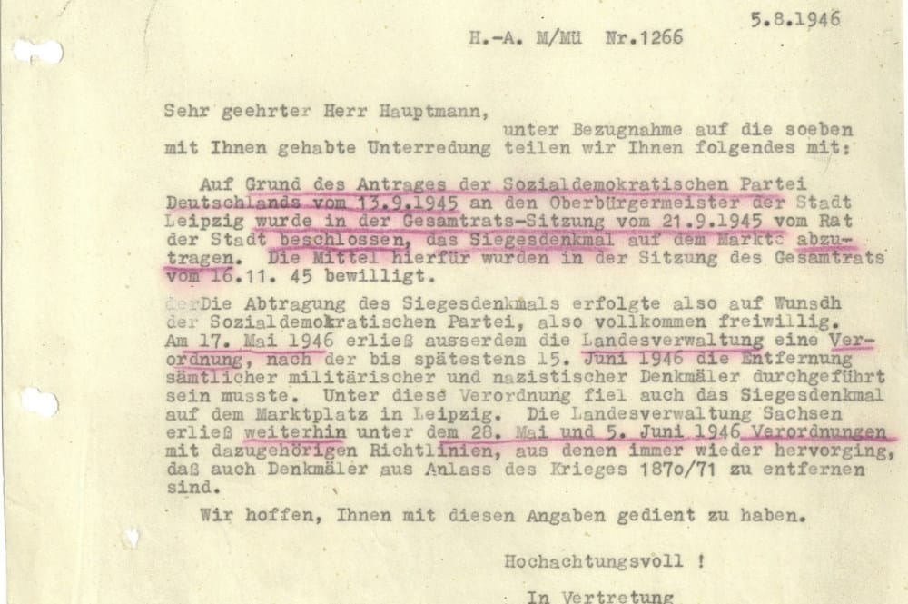 Wie einem Schreiben des Hochbauamtes Leipzig an den Kommissarischen Generalstaatsanwalt im Lande Sachsen vom 18. August 1947 zu entnehmen ist, hat es keine Anordnung der Besatzungsmacht zur Beseitigung des Denkmals gegeben (Anlage 3). Dem Antrag der SPD lagen antimilitaristische Motive zugrunde. Zudem sorgte sich die Antragstellerin um den möglichen Imageschaden, den die Stadt Leipzig durch den Erhalt des seit langem umstrittenen Denkmals auf dem Marktplatz erfahren könnte, denn das Kunstwerk galt im Nachkriegsdeutschland als Verherrlichung des deutschen Militarismus.