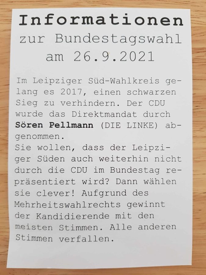 Die kleinen Zettel, die vergangene Woche in Briefkästen im Leipziger Süden geworfen wurden, tragen eine harmlose Überschrift: „Informationen zur Bundestagswahl am 26.09.21“. Doch der Inhalt bietet Diskussionsstoff. Die unbekannten Urheber oder Urheberinnen rufen zu einer taktischen Wahl im südlichen Bundestagswahlkreis Leipzig II auf. Die Wählerinnen und Wähler sollen erneut Linken-Politiker Sören Pellmann wählen, um „die CDU abermals zu verhindern“.Pellmann, Inhaber des Bundestagsmandats im Wahlkreis 153, läge angeblich in allen Umfragen vorn. „Verschenken Sie Ihre Stimme daher nicht, indem Sie chancenlose Kandidierende wählen“, heißt es auf den Flugblättern.