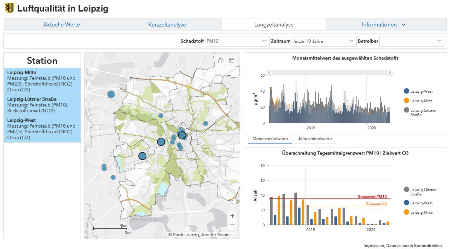 Man findet das neue Dashboard auf der Internetseite www.leipzig.de/luftqualitaet. Mithilfe der neuen grafischen Oberfläche können die Daten zur Schadstoffbelastung auf einem mobilen Endgerät bzw. im Browser ausgewertet und benutzerfreundlich angezeigt werden. Das Dashboard wurde in den vergangenen anderthalb Jahren als Projekt der Digitalen Werkstatt vom Amt für Umweltschutz gemeinsam mit dem Amt für Geoinformation und Bodenordnung sowie der Firma LECOS entwickelt.