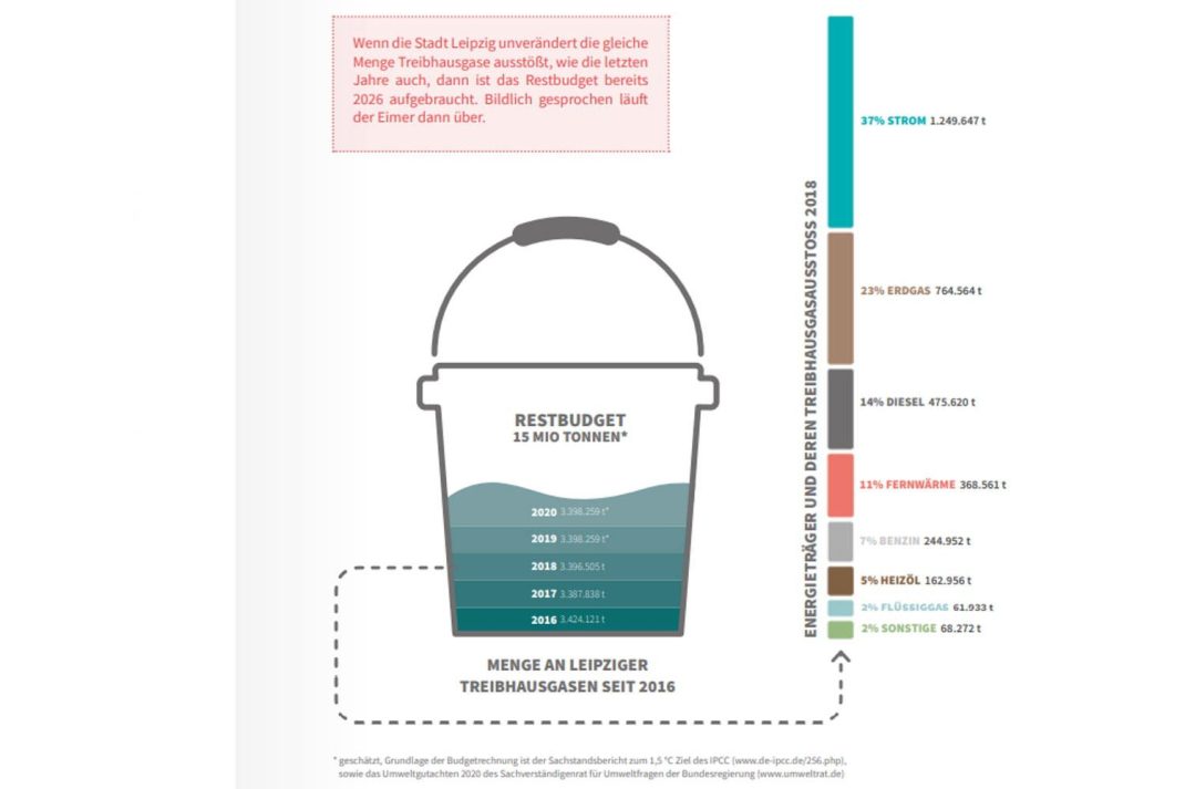 Weiter stellt der Bericht fest: „Aktuellste wissenschaftliche Studien zeigen auf, wie viel Treibhausgas die Atmosphäre noch aufnehmen kann. Der Leipziger Anteil von 32 Millionen t passt umgerechnet in den unten abgebildeten Eimer. Seit 2016, dem Jahr nach Abschluss des Pariser Klimaschutzabkommens, füllt sich dieser jährlich mit ca. 3,4 Millionen t. Bereits ein Drittel ist voll.“