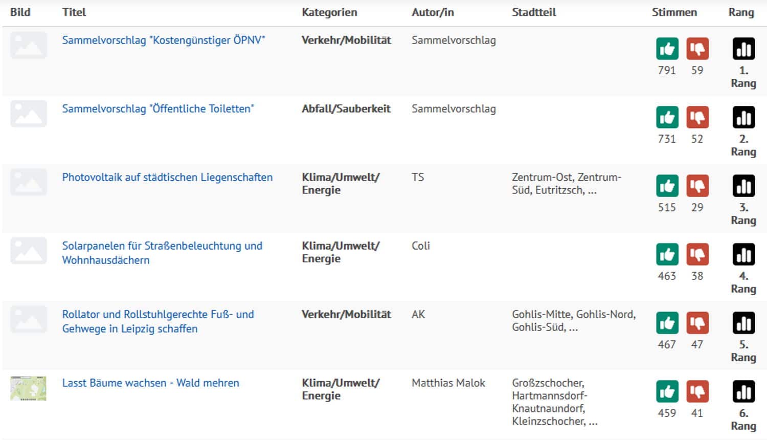 Bei der ersten Online-Abstimmung zum Leipziger Bürgerhaushalt unter dem Motto „Möchten Sie Leipzig mitgestalten?“ waren rund 300 Vorschläge von Bürgerinnen und Bürgern eingegangen. Nach Prüfung der Stadtverwaltung wurden 15.000 zufällig und repräsentativ ausgewählte Leipzigerinnen und Leipziger angeschrieben, diese haben in den vergangenen Wochen anonym und online über die Vorschläge abgestimmt – sodass nun die Top 10 feststehen.