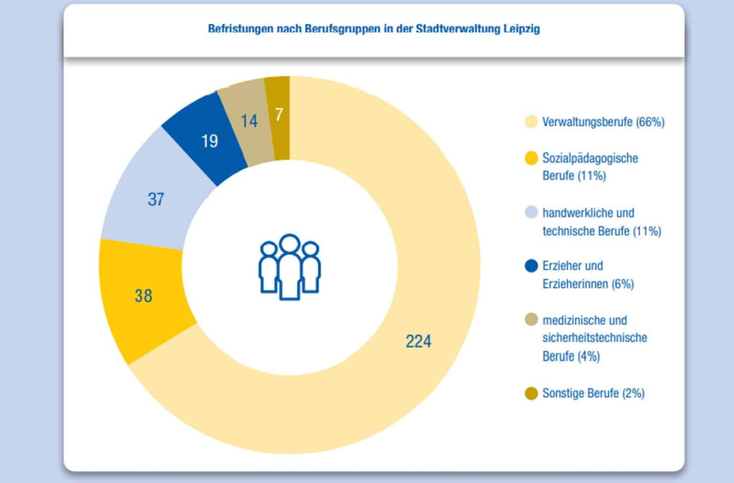 „Von den 8.535 Beamtinnen und Beamten und Tarifbeschäftigten der Stadtverwaltung Leipzig waren zum Stichtag 31.12.2021 insgesamt 339 Personen in einem befristeten Arbeitsverhältnis. Dies entspricht einem Anteil von 4,0 %. Im europäischen und deutschen Vergleich liegt die Stadtverwaltung damit deutlich unter dem Durchschnitt. Während in Deutschland im Jahr 2019 durchschnittlich 7,4 % der Beschäftigten befristet beschäftigt waren, waren es in Europa sogar 10,7 %. Im Vergleich der Berufsgruppen werden dabei die Verwaltungsberufe am häufigsten befristet“, versucht das Verwaltungsdezernat zu erklären.