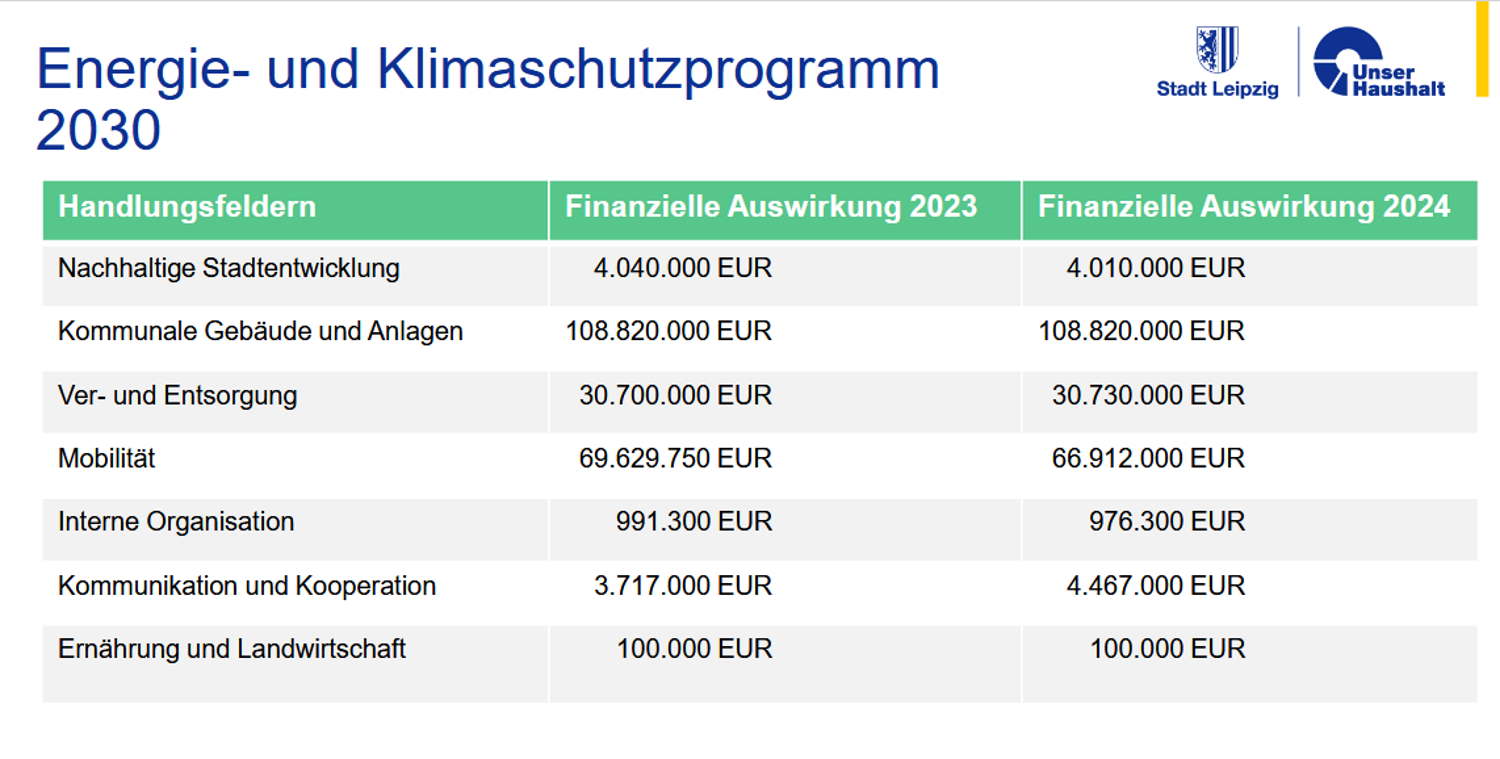 Die Natur- und Landschaftspflege inklusive Umweltschutzmaßnahmen wird mit 47 Mio. Euro ausgestattet, darunter etwa die Gestaltung des Elstermühlgrabens mit 5,9 Mio. Euro, das Programm „Zukunft Stadtgrün“ mit 5,5 Mio. Euro, für schönere Parkanlagen werden 3,3 Mio. Euro und für Spielplätze werden rund 5 Mio. bereitgestellt. Der Saale-Elster-Kanal-Radweg erhält 2 Mio. Euro sowie zusätzliche 1 Mio. Euro für Maßnahmen aus dem neuen Energie- und Klimaschutzprogramm (EKSP).