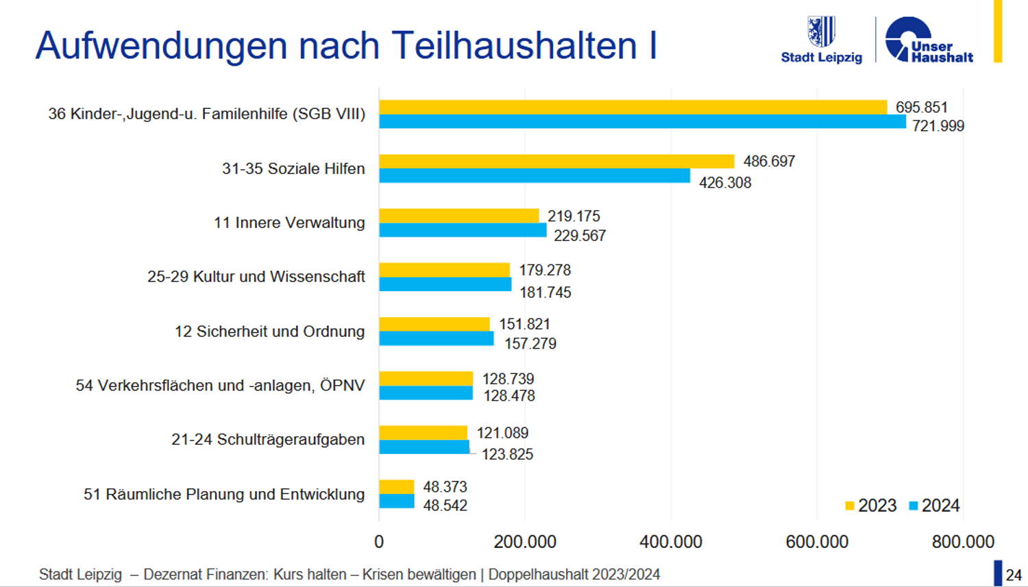 Die öffentliche Auslegung des Entwurfes für den Doppelhaushalt erfolgt vom 19. bis 30. September 2022. Bis 12. Oktober können die Leipzigerinnen und Leipziger Bürgeranträge in Form von Einwänden stellen. Nach der Auslage des Entwurfs behandeln ihn die Fachausschüsse des Stadtrates und die Ortschaftsräte. Die Beschlussfassung des Haushaltsplanes ist am 8. Februar 2023 vorgesehen.