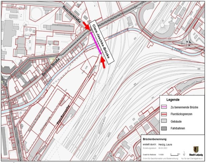Die ersten Bauarbeiten begannen im April dieses Jahres. Auch eine neue Brücke über die Parthe soll entstehen. Die Verwaltung schlägt dem Stadtrat nun vor, diese nach der Eisenbahnerin und Feministin Clara Jaschke zu benennen.