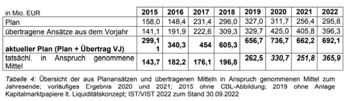 Die stetig gestiegenen Reste der Vorjahre sowie ggf. Reste, die aus dem Jahr 2022 resultieren, sollten in der neuen Haushaltsplanung berücksichtigt, aber auch grundlegend evaluiert werden. In der nachfolgenden Tabelle wird deutlich, dass Investitionsauszahlungen von maximal 330,6 Mio. EUR, meist aber deutlich darunter, realisierbar waren.“