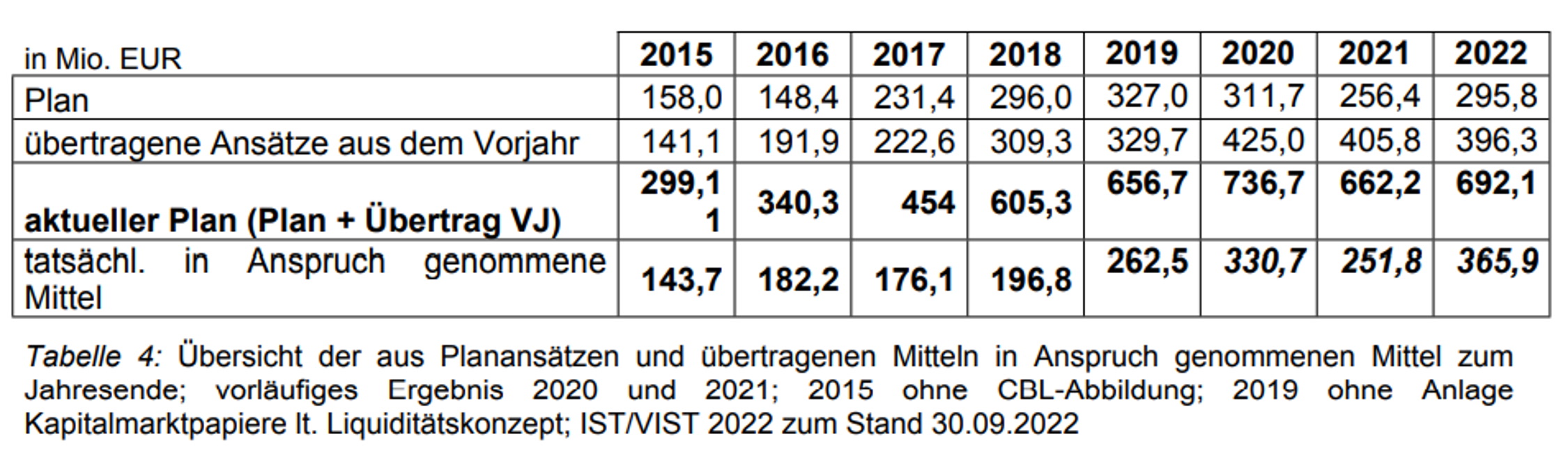 2020 wurden zum ersten Mal 330,7 Millionen Euro erreicht, was dann auch erstmals ein Abschmelzen des Ausgaberesteberges mit sich brachte. Mit 365,9 Millionen Euro wird 2022 wahrscheinlich ein neuer Höchstwert erzielt.