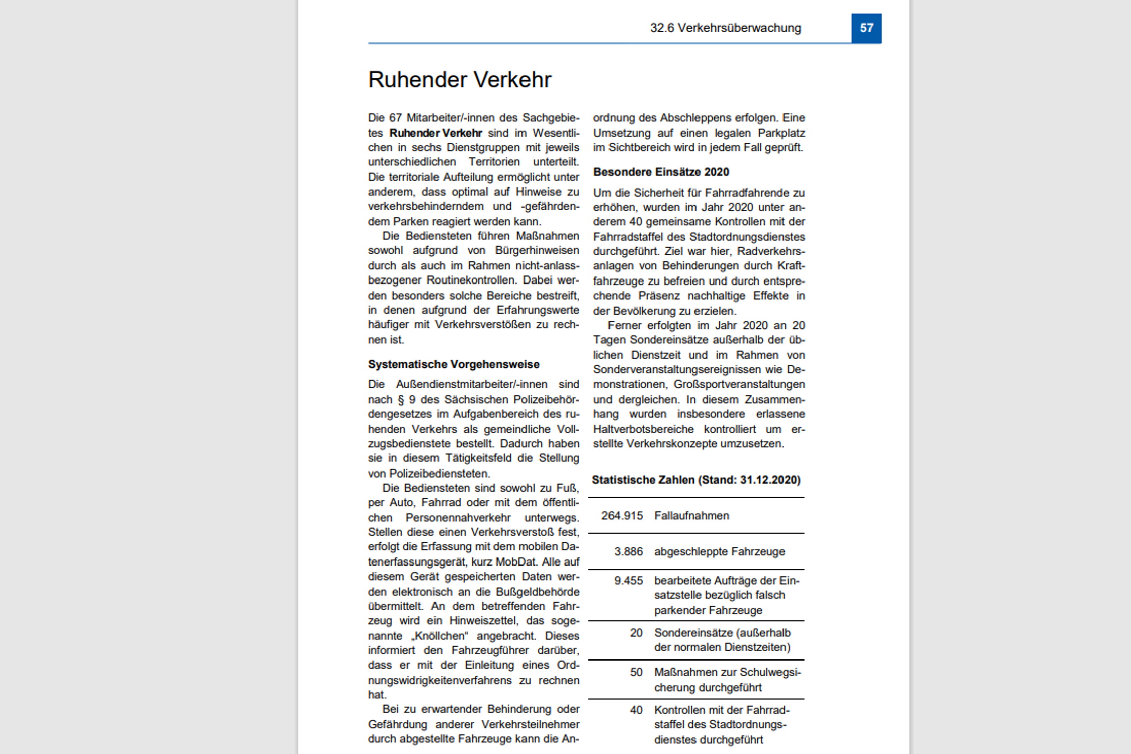 Ausführlich wird die Zuständigkeit im Geschäftsbericht des Ordnungsamtes für das Jahr 2020 (VII-Ifo-06460) ab Seite 58 ff. dargelegt, der in der Ratsversammlung vom 09.02.2022 durch den Stadtrat zur Kenntnis genommen wurde.