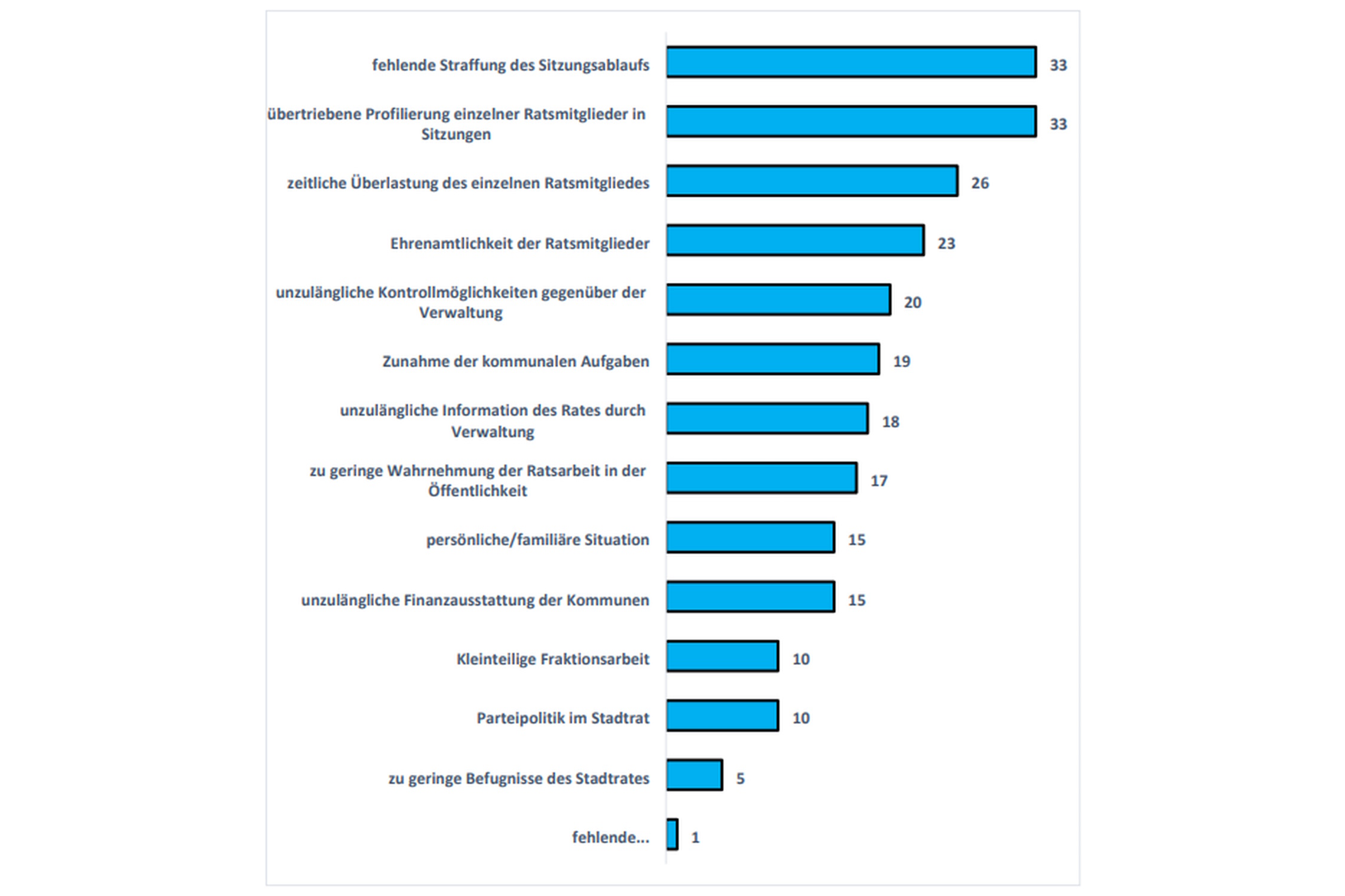 Ein großer zeitlicher Faktor ist nach den Angaben der Ratsmitglieder die persönliche Sitzungsvorbereitung. Diese macht durchschnittlich 17,2 Stunden, über 20 Prozent des Zeitaufwandes für die Stadtratstätigkeit, aus. Auch die Bürgerkontakte und die Teilnahme an Veranstaltungen im Rahmen der Stadtratstätigkeit, wie zu städtischen Ehrungen und Eröffnungen, verursachen einen zeitlichen Mehraufwand von etwa 13 Stunden jeden Monat.“