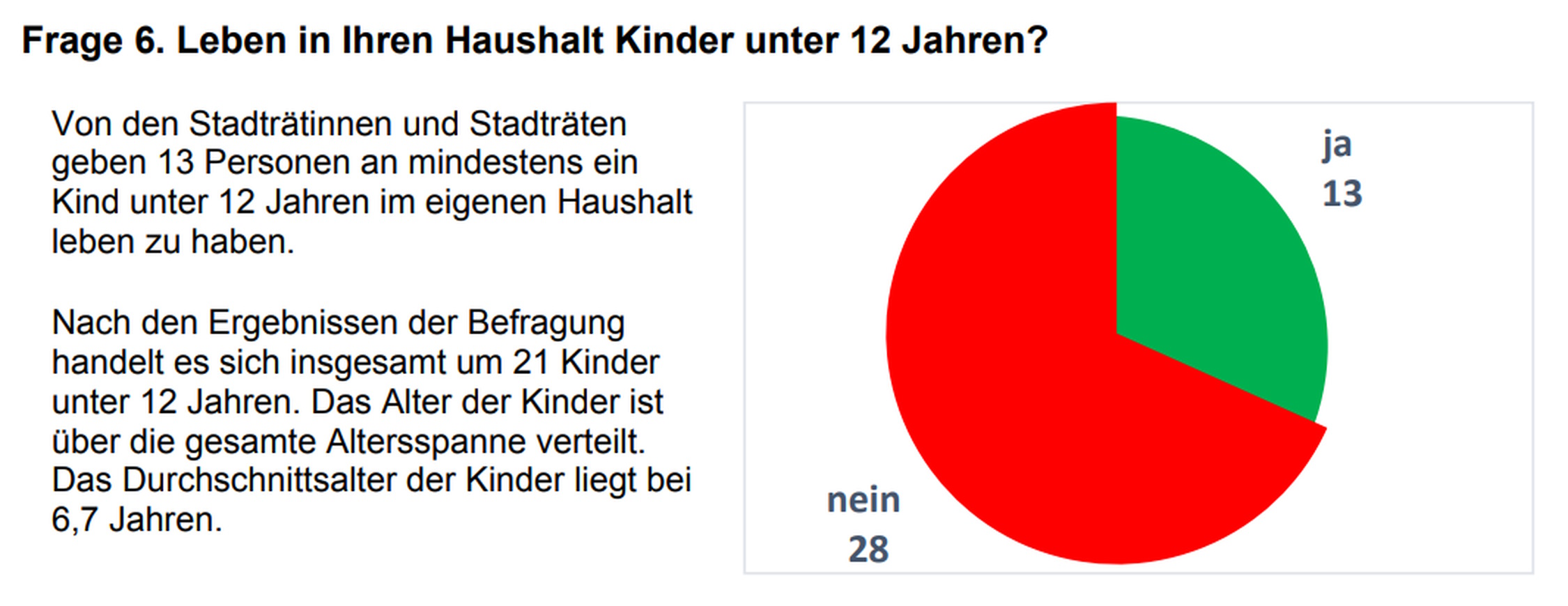 Denn von den Ratsmitgliedern, die geantwortet haben, sind 32 zwischen 40 und 59 Jahre alt. Da sind die Kinder in der Regel aus dem Gröbsten heraus oder sogar schon ganz aus dem Haus. Aber 32 von 41 sind nun einmal 78 Prozent. Dazu noch drei Stadträt/-innen über 60 (zwei davon offiziell schon Rentner). Nur sechs waren unter 40 Jahre alt.