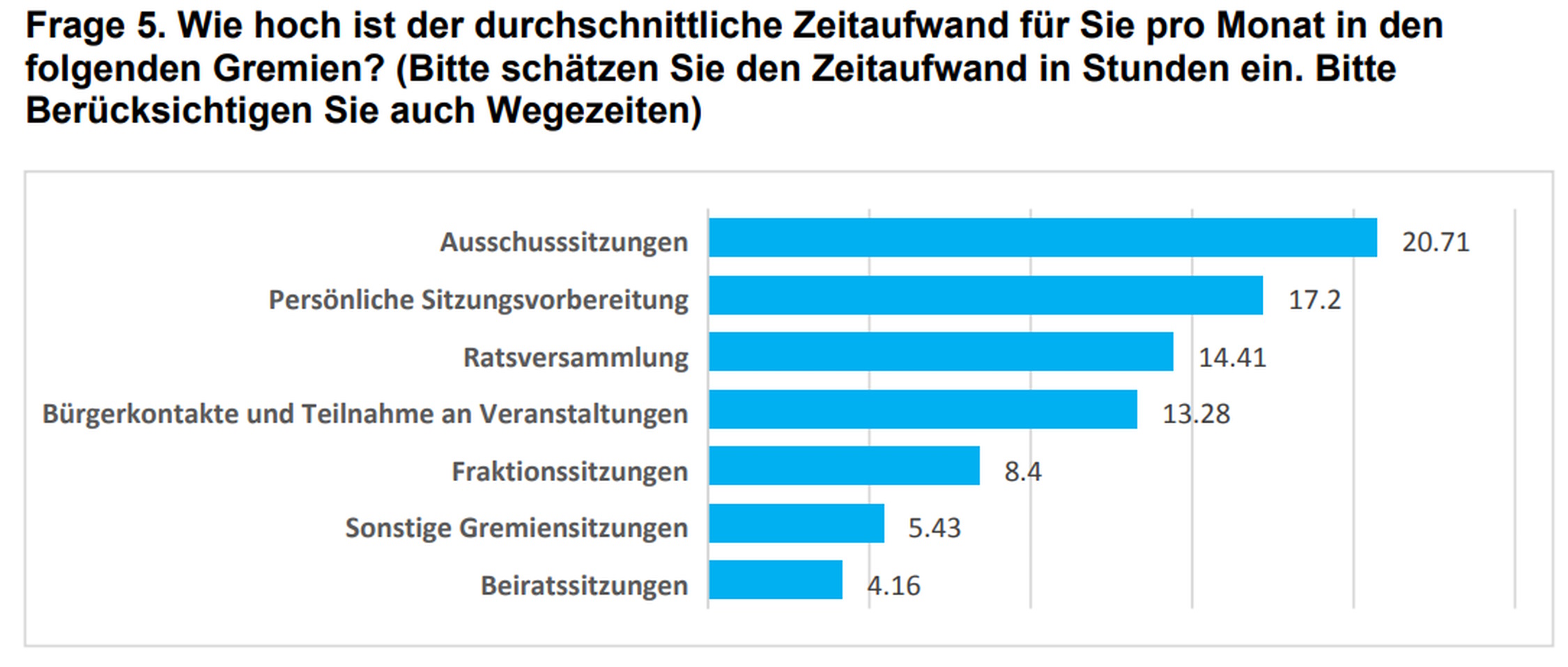 Ein zentrales Ergebnis dabei: „Die Stadträtinnen und Stadträte geben im Durchschnitt an, dass sie 83,6 Stunden für ihre ehrenamtliche Tätigkeit pro Monat einsetzen. Dies entspricht knapp 20 Stunden pro Woche. Für die Fachausschusssitzungen werden durchschnittlich 20,7 Stunden angegeben. Dies entspricht etwa drei Stunden pro Sitzung.