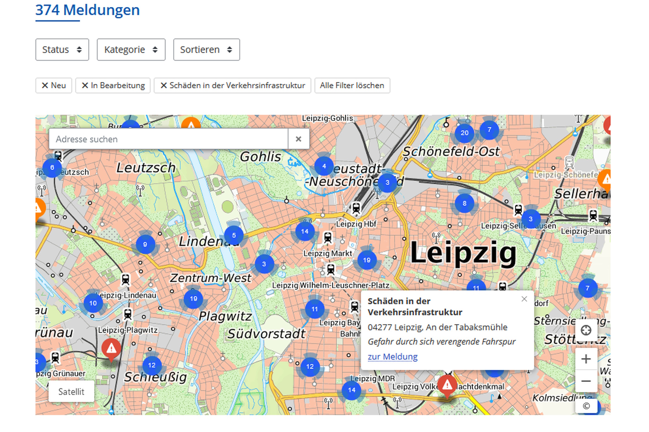 „Der Mängelmelder der Stadt Leipzig ist in verschiedene Kategorien untergliedert. Unter anderem gibt es eine Kategorie zum Thema ‚Schäden in der Verkehrsinfrastruktur‘, wo 244 Problemanzeigen (Stand: 23.3.2023) erfasst sind“, schrieb die SPD-Fraktion in ihrer Anfrage.