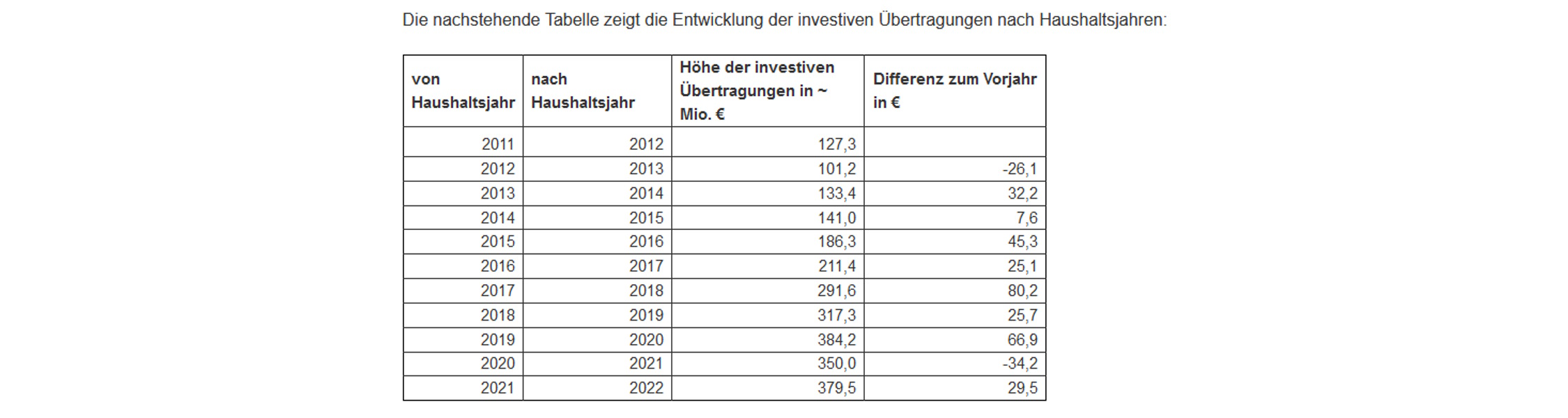 Im Haushaltsjahr 2022 stellt sich erneut ein ähnliches Bild dar. Das heißt, in 2022 standen Zuschüsse für Investitionstätigkeit von insgesamt 787,5 Mio. € zur Verfügung. Darin enthalten waren übertragene Ansätze aus 2021 in Höhe von 379,5 Mio. €. Zum Stichtag 28.02.2022 wurden davon rd. 339,2 Mio. € in Anspruch genommen, sodass in 2022 Ansätze in Höhe von 448,3 Mio. € nicht verbraucht wurden.“