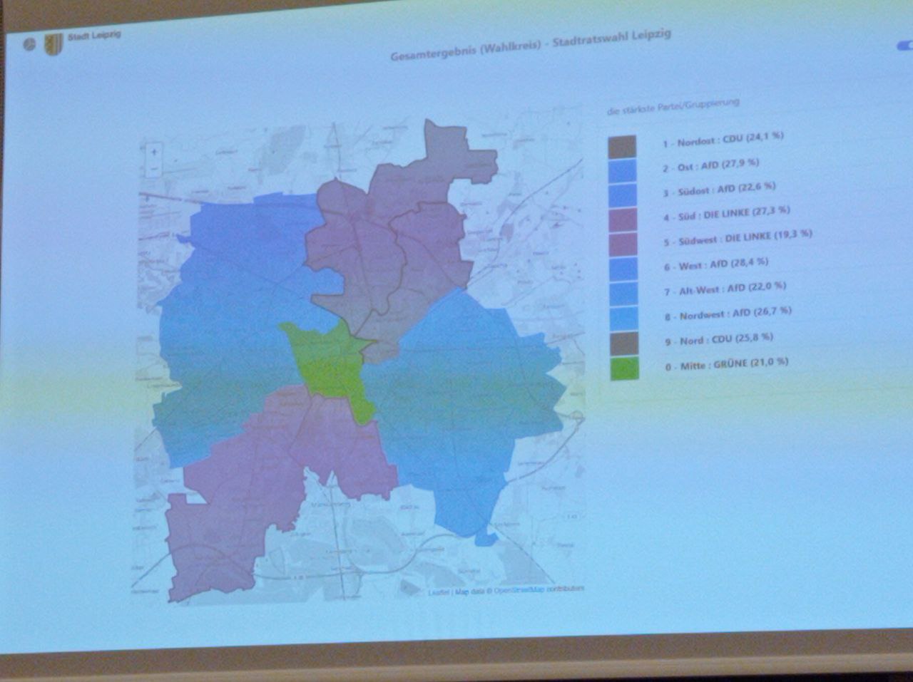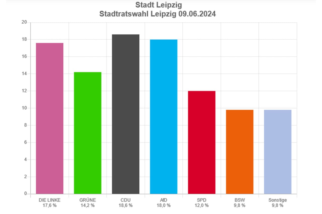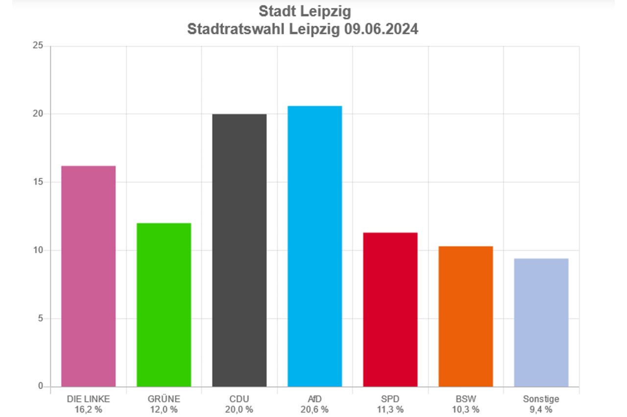 So langsam trudeln auch die ersten Auszählergebnisse zur Stadtratswahl ein. Etwa zehn Prozent der Stimmbezirke sind ausgezählt. Und wenn das Bild heute Abend so bleibt, bekommt Leipzig einen Stadtrat, wie es ihn noch nie hatte – mit AfD und CDU als stärkste Fraktionen, mit jeweils über 22 Prozent.