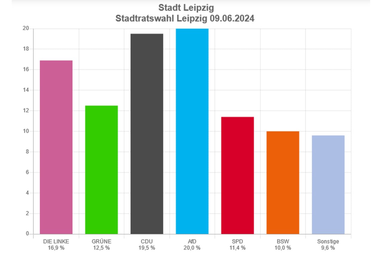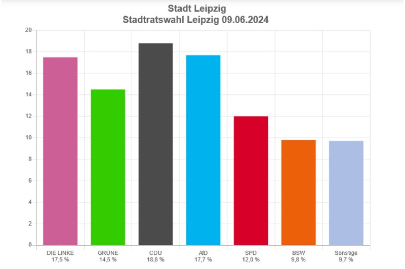 Aber mit 13 Stadträtinnen und Stadträten wird sie voraussichtlich weiterhin eine gewichtige Rolle im Leipziger Stadtrat spielen. Die Grünen würden bei aktuell 14,4 Prozent etwa 6 Prozent verlieren. Mit aktuell 12 Prozent wäre die SPD relativ nah an ihrem Ergebnis von 2019 mit 12,4 Prozent. Aber unübersehbar zieht mit dem BSW eine neue Partei ins Stadtparlament ein, von der man freilich noch nicht so recht weiß, wie sie sich einsortieren und verhalten wird.