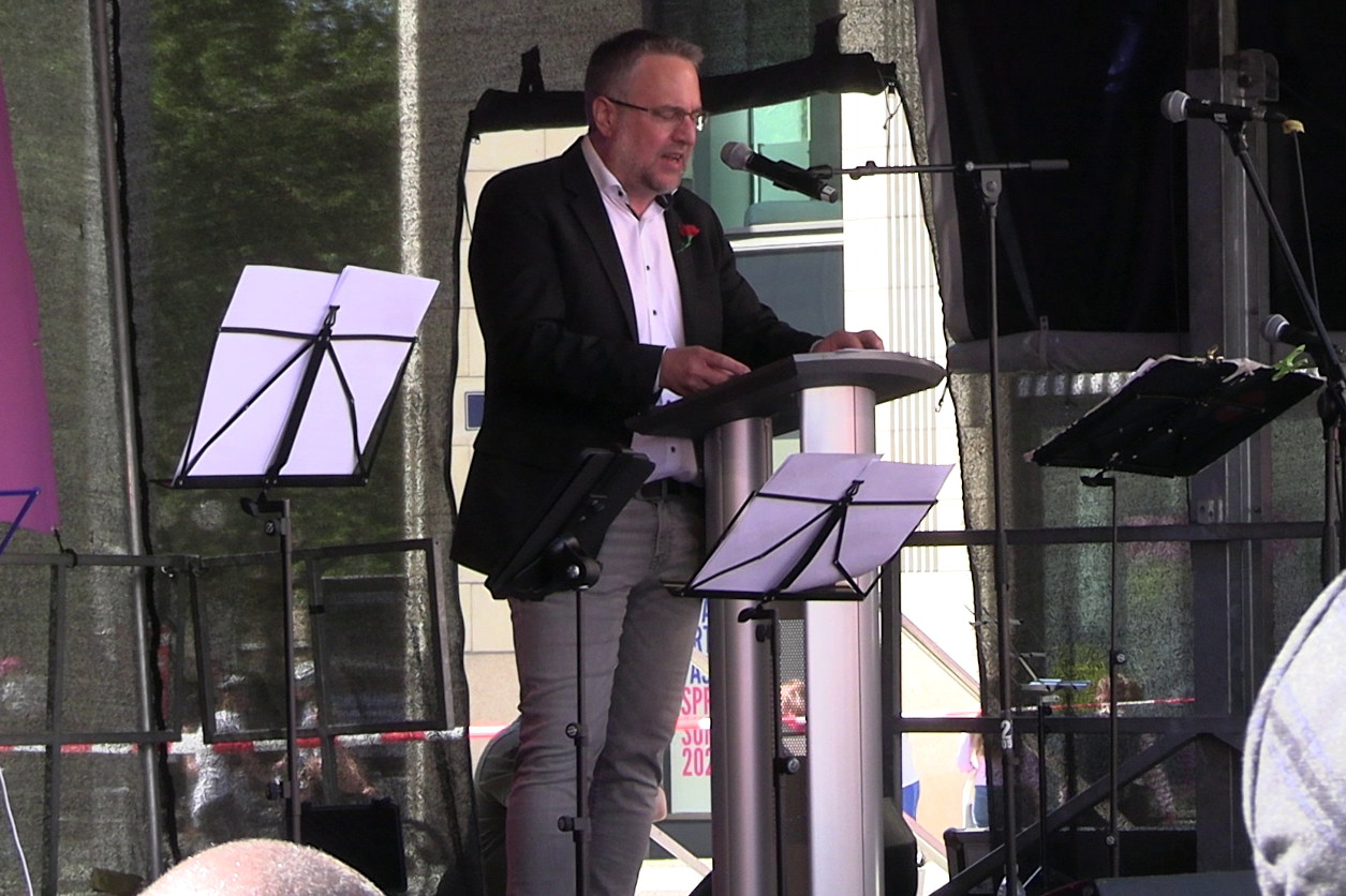 Gegen 11.30 trafen fast zeitgleich der Fahrrad-Korso und die Hauptdemonstration auf dem Marktplatz ein und Carsten Burckhardt, Mitglied im Bundesvorstand der IG BAU hielt die Eröffnungsansprache. In dieser ging er mit einem Rundumschlag auf verschiedene Probleme, vom Ukraine-Krieg bis zu den arbeitspolitischen Forderungen der Gewerkschaften ein.