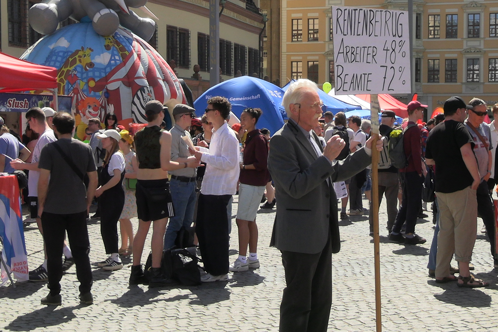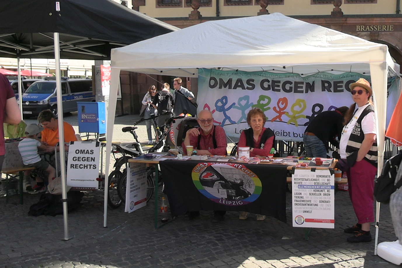 Während der Demonstrationszug unterwegs war, füllte sich der Marktplatz schon mit Kundgebungsteilnehmern und Neugierigen. An den Ständen der Gewerkschaften, Parteien und Organisationen kam es zu ersten Gesprächen.