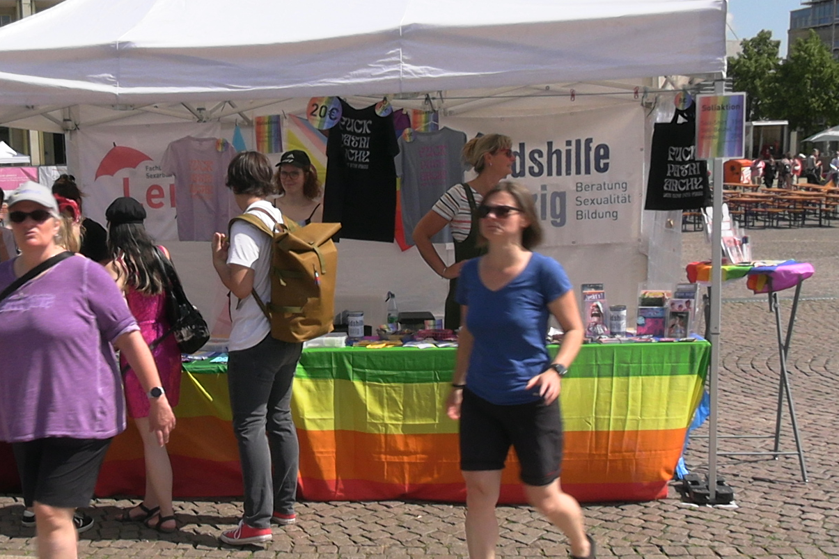 Den gemeinsamen Stand von Aidshilfe Leipzig und Leila (Fachberatungsstelle Sexarbeit) besuchten wir auch. Sandra Bischoff, Sozialarbeiterin bei der Aidshilfe, fragten wir: „Warum seid Ihr hier?“