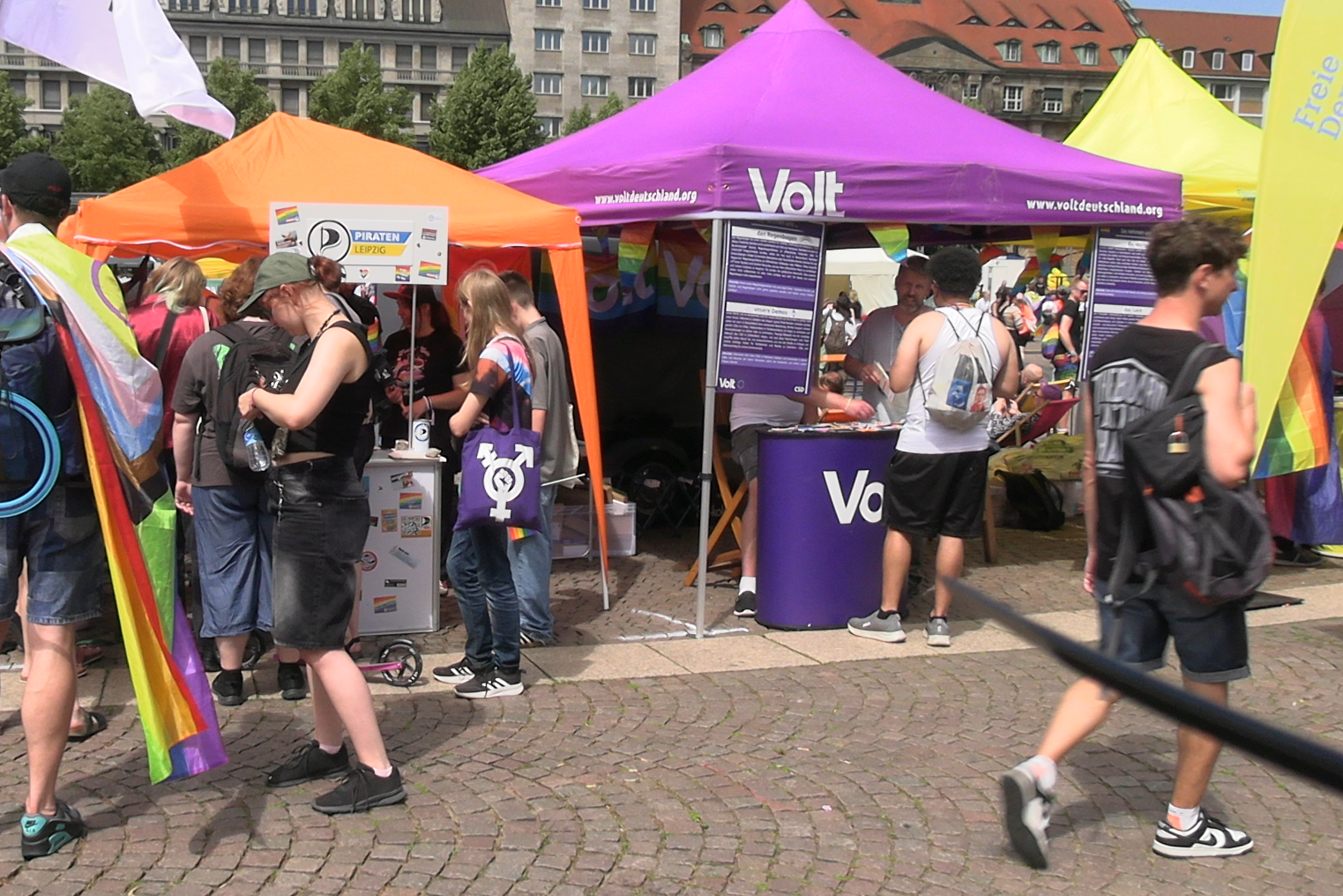 Am 28. Juni war wieder CSD in Leipzig und tausende, nicht nur queere, Menschen ließen sich von der angekündigten Hitze nicht abhalten und strömten ab 10 Uhr zum Augustusplatz. Dort waren zahlreiche Stände von Initiativen, Parteien, Gewerkschaften und Firmen aufgebaut. Ein reichhaltiges Angebot an Beratung zu vielseitigen Themen rund um die LGTBQ+ Community wurde geboten und von Anfang an wurde dies gut angenommen.
