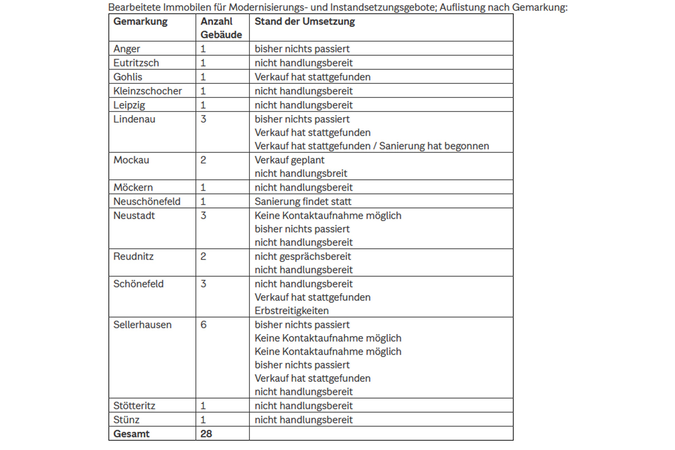 „Eine weitere Hürde für den Erlass eines Modernisierungs- und Instandsetzungsgebotes ist die Betrachtung der wirtschaftlichen Vertretbarkeit. Ein Gebot darf nur erlassen werden, wenn eine Wiedernutzbarmachung wirtschaftlich vertretbar ist. Wenn Abriss und Neubau im Vergleich zur Beseitigung der Missstände und Mängel rechnerisch günstiger sind, wäre ein Gebotserlass rechtlich voraussichtlich nicht haltbar. Da viele der leerstehenden Gebäude in Leipzig seit vielen Jahren ungenutzt sind, sind mit ihrer Wiedernutzbarmachung sehr hohe Kosten verbunden.“