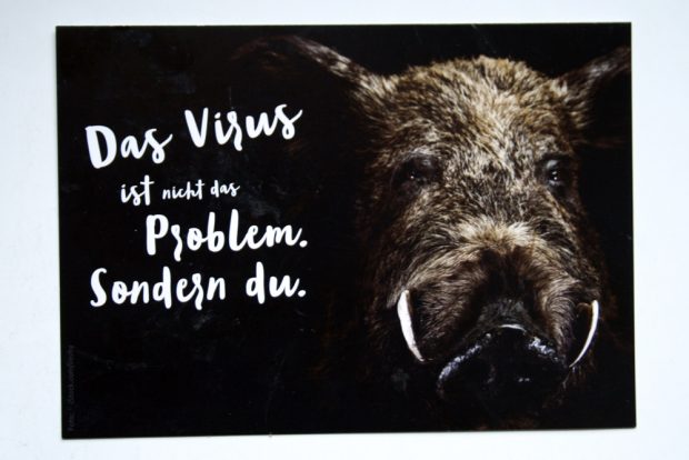 Weshalb das Sächsische Sozialministerium einen möglichen Weg zu vorbeugenden Eindämmung der Seuche nicht nur im Abschießen der – aus Regierungssicht zu großen – Wildschweinbestände in Sachsen sieht, sondern auch in der Aufklärung der Reisenden. 120.000 kostenlose Postkarten (mit einer grammatikalisch etwas seltsamen Beschriftung) wurden unter anderem an sächsischen Rastplätzen verteilt.