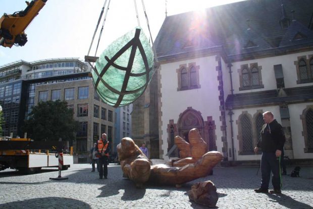Gelandet ist die Glasarche am Donnerstag mit einem Schwertransport. Gerade einmal 20 Minuten dauerte es, erst die eindrucksvolle Holzskulptur einer offenen Hand auf dem Thomaskirchhof nördlich der Thomaskirche abzusetzen, um danach die gläserne Arche darauf zu platzieren, die in ihrer Brüchigkeit an die Gefährdung unserer Erde erinnert. Sie rutscht geradezu aus der großen, schützenden Hand und alles ist offen: Wird sie auf dem freien Meer zerschellen? Werden ihre Bewohner sich so benehmen, dass die gläserne Bordwand völlig zersplittert und all das, was die Arche – sinnbildlich für den bedrohten Planeten Erde – mit sich trägt, über Bord geht?