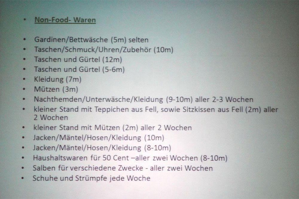 Könnte man auch einen anderen Tag als Markttag festlegen? Kerstin Kaiser dazu: Ein anderer Tag als Markttag ist schwierig, da die meisten Händler bereits feste Touren und meist keine anderen freien Tage mehr haben. Sie sind ausgebucht. Man könne es aber probieren und die Händler daraufhin ansprechen.