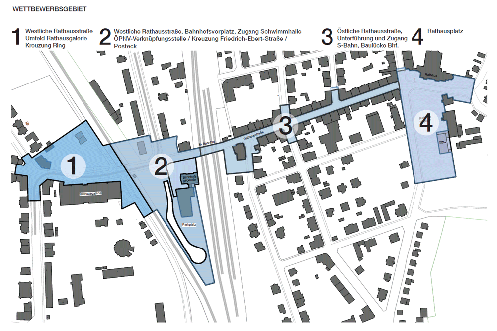 Teilbereich 2: Westliche Rathausstraße (vom Bahnübergang bis zur Kreuzung Fr.-Ebert-Straße, vorbei am Bahnhofsvorplatz bis zur Brücke S-Bahnhof, darin eingeschlossen der Bereich südlich der Rathausstraße mit der Buswendeschleife und der Schwimmhalle)