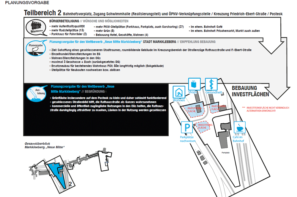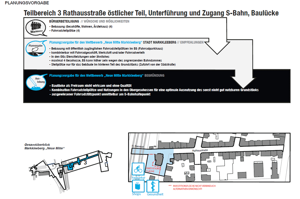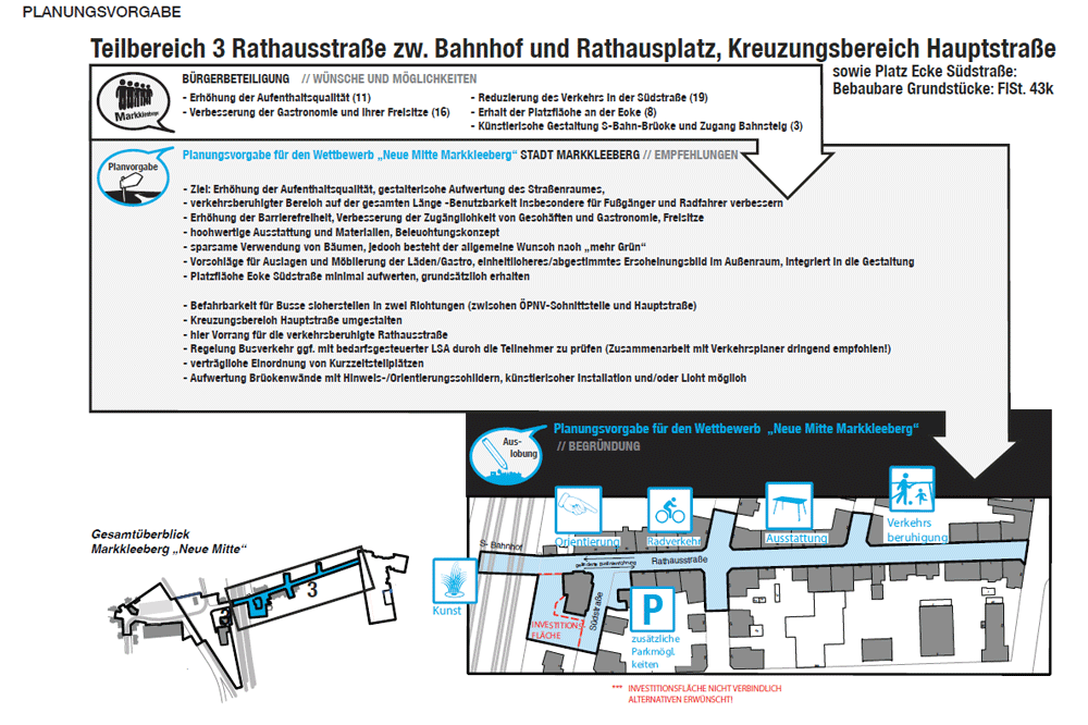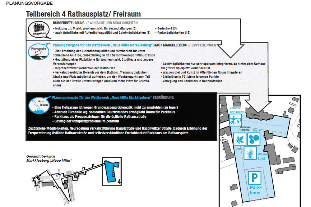 Hier noch mal die gesamte Präsentation (pdf-Datei) mit den gesammelten Anregungen der Einwohner und den daraus abgeleiteten Empfehlungen: Städtebauliche Entwicklung Rathausstraße und Bahnhofsumfeld in Markkleeberg