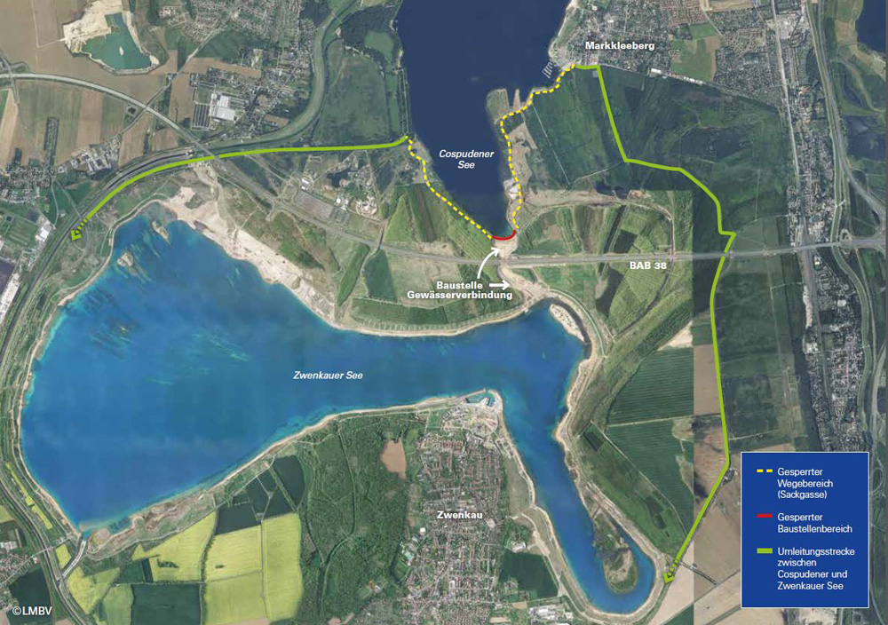 In diesem Zusammenhang betont die LMBV jetzt: “Während des regulären Bauablaufs ist es notwendig, bereits bestehende Wegeverbindungen im Umfeld der Baustelle zeitweilig umzuverlegen beziehungsweise vorübergehend zu sperren. – Aufgrund der anspruchsvollen Baugrundverhältnisse sind auch kurzfristige Absperrungen möglich. Dazu gehört jetzt auch die Sperrung am Südufer des Cospudener Sees, wo es Anfang Juni 2015 im Baustellenbereich bei den laufenden Rüttelstopfarbeiten nördlich der Bundesautobahn 38 unweit des Cospudener Sees zu Aufbrüchen der Geländeoberfläche und zu Wasseraustritten kam. ”