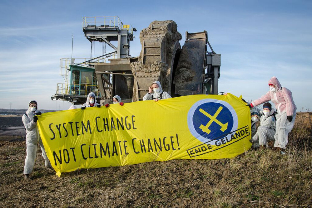 Am Samstag, 5. Dezember, besetzten AktivistInnen einen Braunkohlebagger im Tagebau „Vereinigtes Schleenhain“ bei Leipzig, verkündete die Gruppe von Klimaaktivisten stolz. Die Fotos, die der L-IZ vorliegen, zeigen kein so riskantes Manöver. Die Aktivisten sind nur – hübsch bekleidet mit weißen Anzügen und einem großen Transparent – ins Tagebaugelände des Tagebaus “Vereinigtes Schleenhain” marschiert. Vor der Abbruchkante und die Führerkanzel des Baggers im Blick entfalteten sie dann ihr Transparent: “System change – not climate change!” Mit dem Hinweis: “Ende Gelände”.