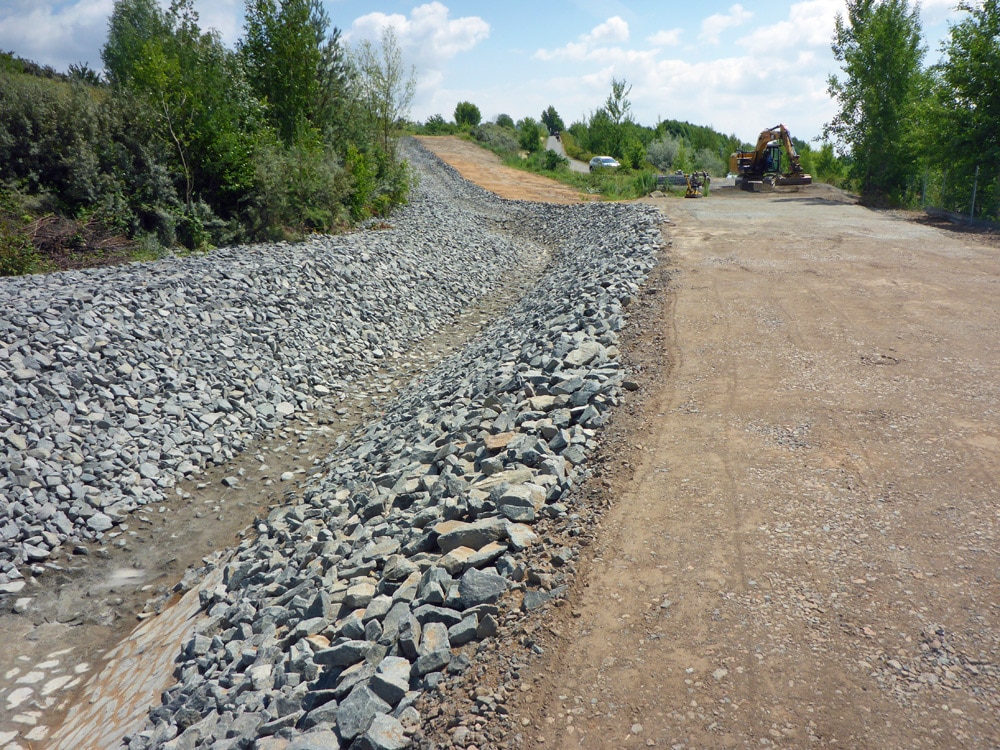 Unter der Wasserbausteinbefestigung wurde die Erde bis auf 30 Zentimeter Tiefe ausgetauscht. Zur Überwindung des Höhenunterschiedes wurden außerdem Kaskaden angeordnet, die neben der Energieumwandlung gleichzeitig der Sauerstoffanreicherung des Grabenwassers dienen. Im Gewässerrandbereich erfolgen noch Pflanzungen von Gehölzen zur Beschattung des Gewässers. Vorhandene Wege werden mit Durchlässen gequert.