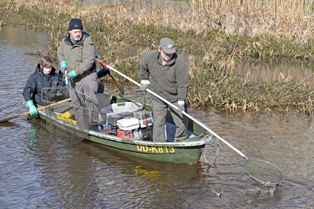 Am 11. März hat planmäßig das Abfischen in den ersten zwei Bauabschnitten des Wallgrabens begonnen. Mitglieder des Anglerverbandes Leipzig holten per Elektrofischen Hechte, Karpfen, Stichlinge und sogar einen Aal aus dem Gewässer. Der Fischbestand wurde in den noch wasserführenden Teil des Wallgrabens umgesetzt. Am 13. März wurde eine Restabfischung durchgeführt. Man hatte im fast wasserlosen Gewässerabschnitt noch eine Suche nach Krebsen und Muscheln angeschlossen, die – so fordern es die Naturschutzbehörden – ebenfalls in die wasserführenden Wallgrabenbereiche umgesetzt werden mussten.