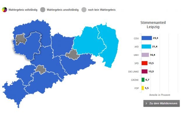Auch im Landkreis Leipzig landete zur Kreistagswahl am 26. Mai die CDU mit 23,3 Prozent knapp vor der AfD mit 21,4 Prozent. Nur ihre überragende Stellung ist dahin: Sie verlor 11,7 Prozent. Im Grunde ähnelt das Wahlergebnis im Landkreis Leipzig erstaunlich dem im Landkreis Nordsachsen. Von einer hellblauen Monotonie im Osten kann keine Rede sein.