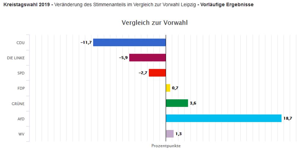 Vergleich der Kreistagswahlergebnisse im Landkreis Leipzig 2014 und 2019. Grafik: Freistaat Sachsen