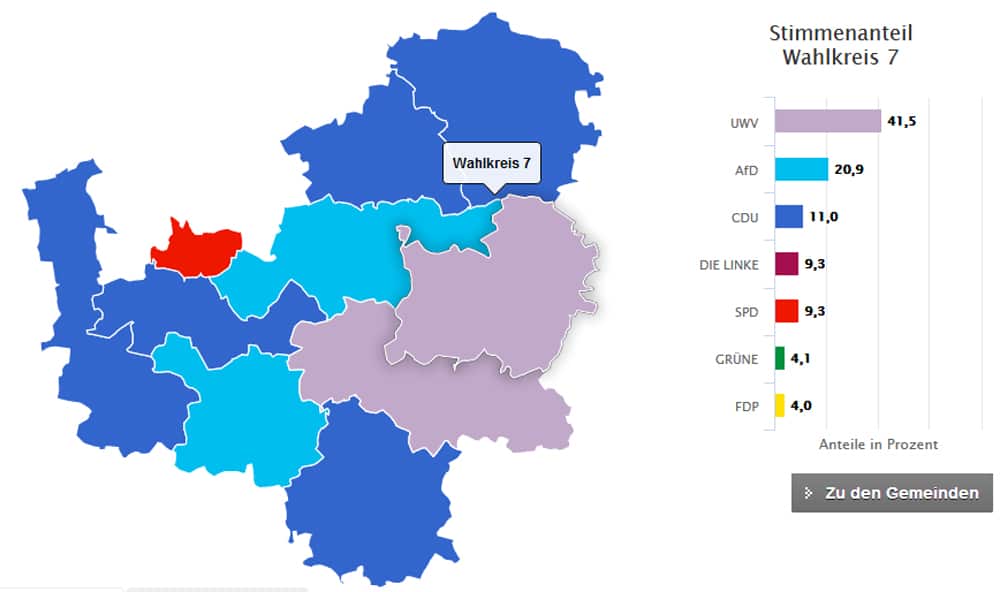 So haben zwar neben der CDU auch die SPD (- 2,7 Prozent) und die Linke (- 5,7 Prozent) im Landkreis verloren. Aber dazugewonnen hat auch hier nicht nur die AfD, sondern auch Grüne (+ 3,6 Prozent), FDP (+ 0,7 Prozent) und die Unabhängigen Wähler (+ 1,3 Prozent). Die Unabhängigen sind mit 16,4 Prozent jetzt die drittstärkste Kraft im Landkreis, noch vor SPD (13,5 Prozent) und Linken (13,3 Prozent). Und selbst die Grünen erreichten mit 6,7 Prozent ein Ergebnis, das man vor wenigen Jahren nur in den drei Großstädten erwartet hätte.