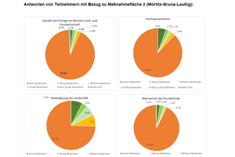 Das Ergebnis des öffentlichen Beteiligungsverfahrens fällt in den vier Maßnahmenbereichen sehr unterschiedlich aus, betont das Landratsamt. In den Bereichen 1, 3 und 4 unterstützten etwa 50 bis 51 Prozent der Teilnehmer die skizzierten Maßnahmen, die vor allem darin bestehen würden, der Mulde in diesem Gebiet wieder Überschwemmungsflächen zu eröffnen. Im Teilbereich 2 (Mörtitz, Gruhna, Laußig) dagegen waren es sogar nur sieben Prozent.