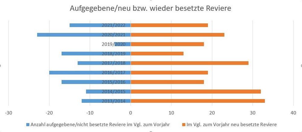 Was den Biberbeobachtern auffällt: Es herrscht eine hohe Dynamik, was die Aufgabe, das Wieder-/Neubesetzen von Revieren angeht. Durchschnittlich werden jedes Jahr 15 Reviere aus unterschiedlichen Gründen aufgegeben und – über die letzten 8 Jahre betrachtet – 22 neu bzw. wieder besetzt.