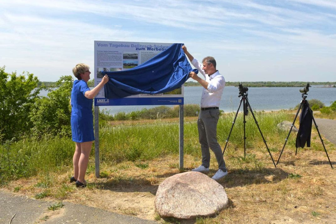 Diese acht neuen Informationstafeln machen Besucher des Naturschutzgebietes Werbeliner Sees jetzt besser mit dessen Geschichte vertraut und sensibilisieren für einen sorgsamen Umgang mit dem artenreichen Areal. Offiziell ihrer Bestimmung übergeben wurden die Tafeln am Montag, 16. Mai, von Nordsachsens Landrat Kai Emanuel und Grit Uhlig, Leiterin des Sanierungsbereichs Mitteldeutschland der Lausitzer und Mitteldeutsche Bergbau-Verwaltungsgesellschaft (LMBV).